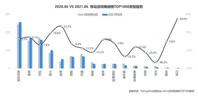 从移动游戏畅销榜TOP1000变化趋势看,移动游戏市场中产品类型并未发生结构性变化,整体仍旧是以角色扮演、策略和动作游戏为主,其中角色扮演和策略游戏的产品数量有所增加,动作游戏则略有下降。卡牌类和休闲类游戏数量增长明显,分别较去年增长18.8%和33.3%。