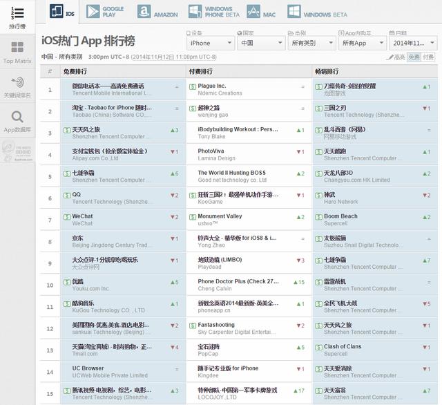 受双十一影响淘宝和京东相关应用在免费榜单上大幅上升,腾讯又一大招“微信电话本”登顶,同时页游时代王者《七雄争霸》强势上升,不知道是不是还是茂哥原作,《太极熊猫》憋了很久终于随着安卓版公测转为免费,成绩不错。受iPhone6国内大量出货影响,装机类应用会霸榜相当长时间,笔者预计会持续要春节后,这对其他应用推广是一大噩耗。