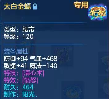 第二件装备同样是120的腰带,不过我们可以明显看到两个装备的差距。因为他们的主人门派不一样,第一个是辅助,这件腰带的主人则是一个曜华。对于曜华来说,一速位的争夺,以及自身生存能力,都是需要首先考虑的问题。所以,这件装备的基础防御属性接近满值,而且单加敏捷也接近满值,更加追求极限属性。在特技和特效方面,清心术和"魔音摄心"一样,同样是一个辅助类型的技能,为队伍的主C服务。