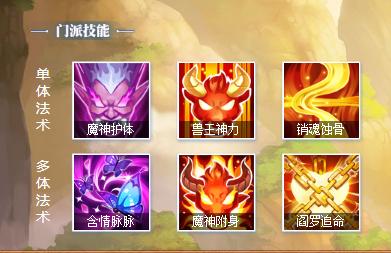 其余四个技能是加攻和震慑两类法术,各对应一项单体法术与多体法术。加攻的单体法术交兽王神力,这项法术可以对一人使用,使用后可以增加自己活着队友的本性魔性,进入狂野状态。这项法术的多体法术叫魔神附身,名称与女魔的魔神附体很像,但是其作用截然不同,魔神附身是能获得战斗魔神的力量,强化本队的攻击力与命中率,最多可以对7人使用。另两项技能则是震慑,单体震慑叫销魂蚀骨,它同样只能对1人使用,能偷偷消耗目标的生命力和魔法。多体震慑叫阎罗追命,是利用阎王的力量按比例消耗目标敌人的生命和魔法,最多可对7人使用。