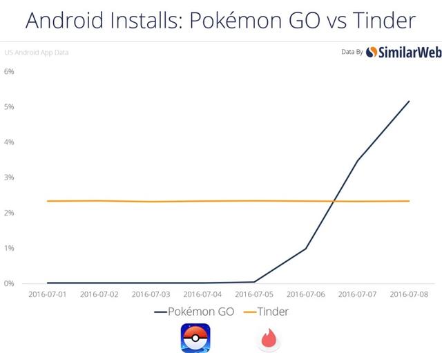 在美国,仅仅上市两天的时间,就已经有 5.16% 的 Android 手机使用者安装了 Pokémon GO App。以美国约 2 亿名智能手机用户的数字而言(其中又有将近 6 成的用户使用 Android 手机),大约已经产生了超过 600 万名 Pokémon GO 训练师,以平均 1 天 300 万的下载量轻松刷上美国 Google Play 的免费 App 第一名。至于美国 iOS 设备的相关数据尽管不清楚,不过 Pokémon GO 也已经登上 App Store 的第一位──这样的安装率,甚至比著名的交友软件 Tinder 还火红。