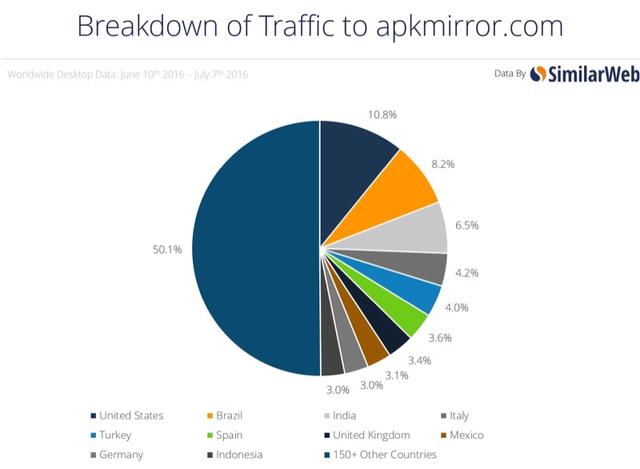 由于目前 Pokémon GO 仅在美国、纽澳开放,其他国家地区的 Android 玩家想尝鲜,就只能经由 APK 包,因此 SimilarWeb 也观察了各国玩家到 apkmirror 网站的流量,从 5 月开始封测以来,apkmirror 的流量已经上冲近 600%(包含电脑端与移动端),来到超过 400 万。其中,又有 19.6% 的电脑端用户使用“pokemon go apk”这个关键字进入 apkmirror,总的来说,也有 30.5% 的电脑端用户使用含“pokemon”的关键字。