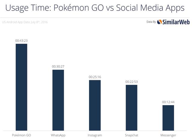 除了启用频率,Pokémon GO 的黏着度也很优异。美国的 Android 用户,平均每天会使用 Pokémon GO 达 43 分钟又 23 秒,超越了一众美国主流的社交通讯软件,包括 WhatsApp、Instagram、Snapchat 与 Facebook Messenger。这 4 款 App 中,单日黏着度最高的 WhatsApp,每天平均使用达 30 分钟又 27 秒,至于 Messenger 则仅有 12 分钟又 44 秒。