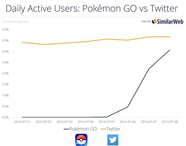 下载安装之余,Pokémon GO 的活跃度也很高,有超过 60% 的美国玩家每天会开启这个 App,在路上捕捉神奇宝贝或争夺道馆。而这样的比例,则相当于有 3% 的 Android 用户、约 360 万人每天使用 Pokémon GO。即使不算上 iOS 数据,这样的成绩也已经能比拟 Twitter──后者是在全球有近 2 亿名活跃用户的大社交网站,而追近它只不过花了 Pokémon GO 两天的时间。