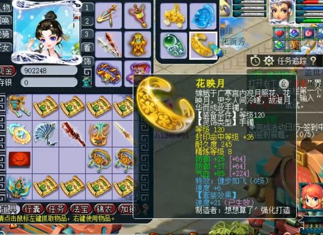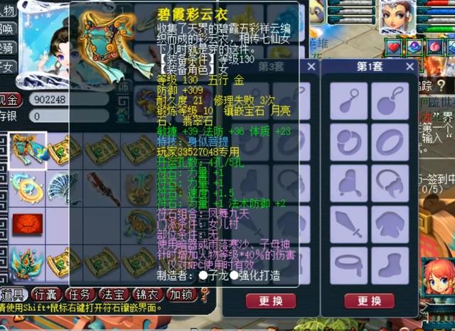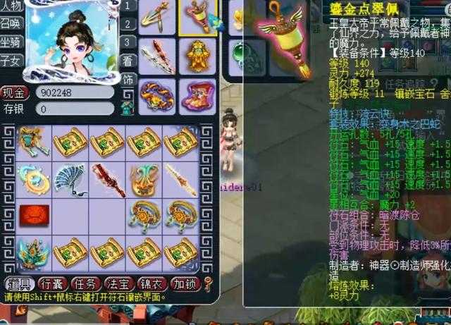 道具行囊有亮点,号主遗留了一件专用装备,打了10级月亮石、翡翠石双宝石,附加了体敏双加62,附加特技身似菩提。