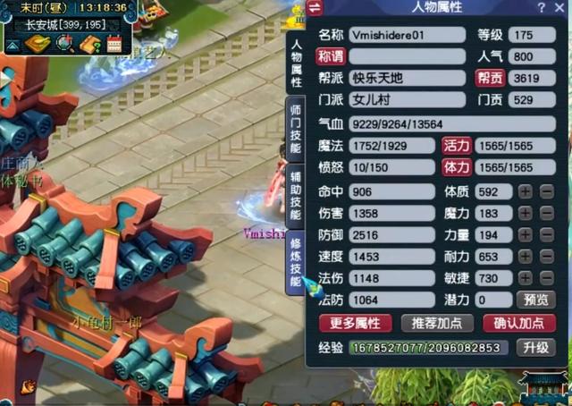 玩家购买到的是一个175级女儿村角色,人物属性为速度1453,伤害1358,防御高达2516,气血上限13654。
