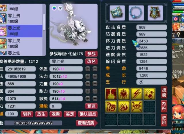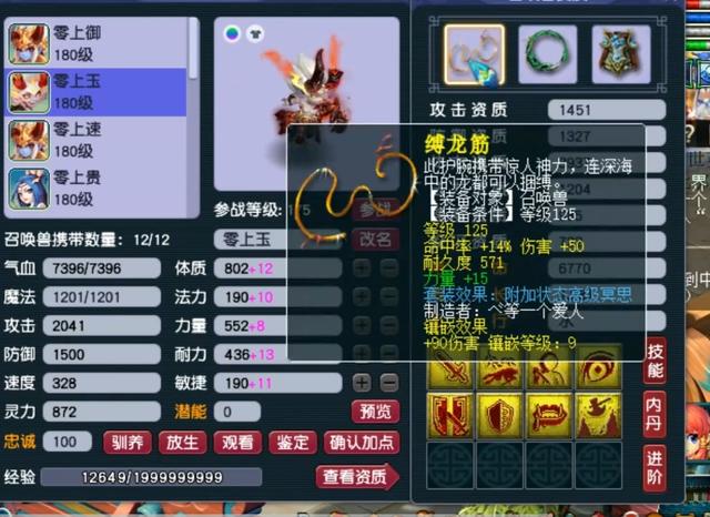 最后展示的是上述角色配置的部分召唤兽宝宝,8技能的力劈华山童子,配置了65伤的宝宝装备。另外还有一只7技能全红谛听,观照万象技能也在,一只四轮驱动的法宠。