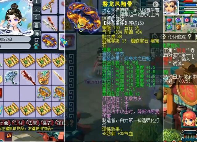 腰带配置是150级装备,锻炼了13段黑宝石,附加愤怒特效,点化了巴蛇套装效果。熔炼效果为防御8点,气血35点。