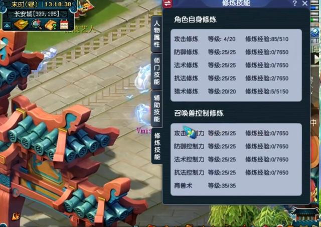 人物以及召唤兽修炼如上图所示,三修全满25级,有一个20级的猎术,宝宝修炼四个全满25级。