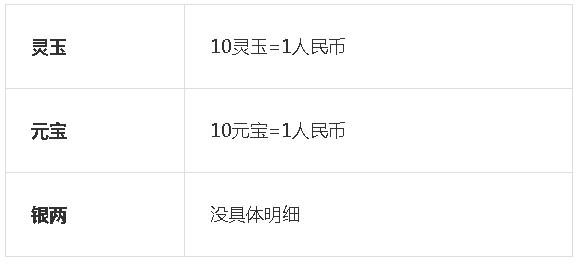 1.游戏内有 灵玉,元宝,银两,共3种货币,其中灵玉和元宝 是游戏商城通用货币,元宝是玩家之间流通货币。