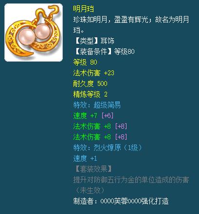 既然说到了80级的好灵饰,下面这个明月珰绝对是一个不错的神器了。它的主属性和下排的属性是很对的。既然下排出现了法伤的2条,那么这个灵饰法系用就肯定是更加好。一条加三法伤的耳饰,还有超级简易的蓝字,这真的是69级法系当之无愧的神器了。宝石是能把星辉石上到8级,这样在属性上会比60级的更加好。除此之外还多了一条速度,现在是一个全门派竞速的时代了,没有哪一个门派不需要速度。这个速度也绝对算是锦上添花。