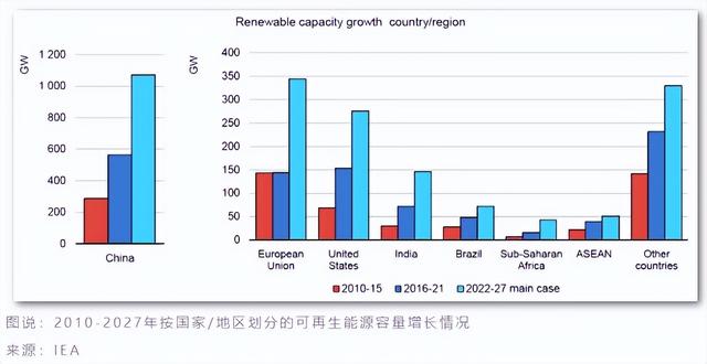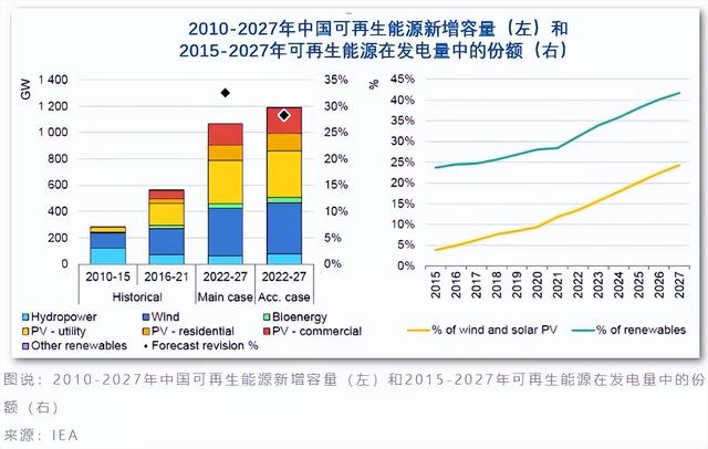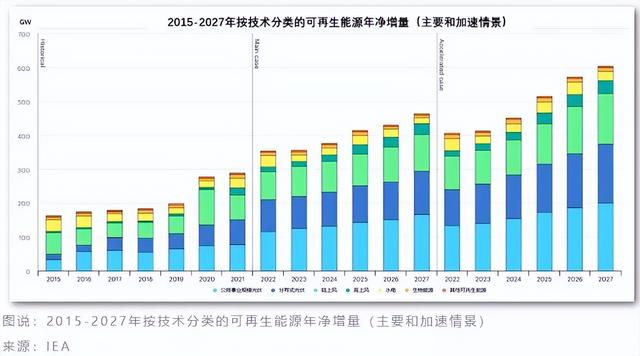 02 中国:未来五年将主导全球可再生能源新增装机容量尽管风能和太阳能光伏补贴已经逐步取消,但由于未来五年的增长速度加快,国际能源署预计 2022-2027年中国在全球可再生能源发电新增装机容量中占比或将接近一半。