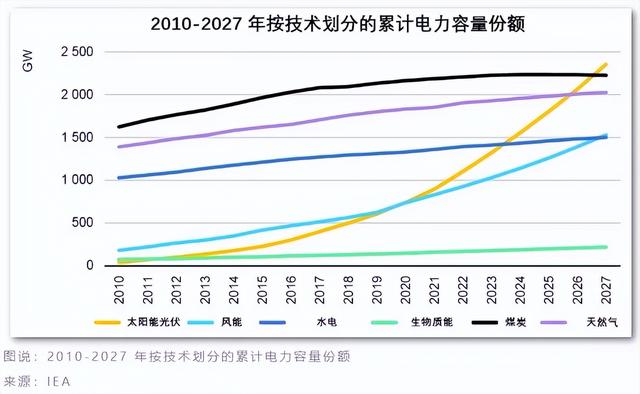 未来五年,风能和太阳能光伏发电量将增加一倍以上,到2027年提供全球近 20%的发电量。在预测期内,这些间歇性技术占全球可再生能源发电量增长的 80%,这将需要额外的电力系统灵活性来源。而在2025 年初,可再生能源将超过煤炭,成为全球最大的发电来源。