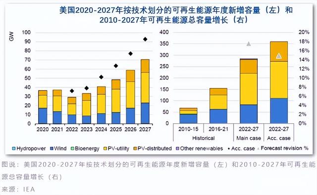 鉴于《通胀削减法案》带来的新激励措施,国际能源署上调了对于美国可再生能源新增装机容量的预测,并预计2022年到2027年美国的可再生能源容量将增加74%,即超过280吉瓦,其中太阳能光伏和风能几乎占据了所有的可再生能源扩张。