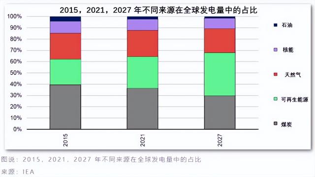 《2022年可再生能源报告》认为,随着煤炭、天然气核能和石油发电的份额不断下降,可再生能源或将是未来五年唯一份额增长的发电来源。可再生能源在电力结构中所占的份额预计将在预测期内增加10个百分点,到2027年达到38%。