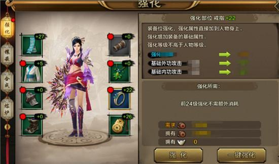 强化系统在游戏前期也是个提升战斗力的好途径,强化系统就是对装备的位置进行基本属性强化,强化属性直接加到任务身上,强化是增加装备的基本属性,强化等级不能高于人物等级,强化到20多级是非常简单的,只需要消耗一些钱币,20多级之后,需要消耗强化符,游戏中很多活动都可以获得,也可以在帮会商店中用帮会贡献度兑换,很划算。每次强化都能提升一些战斗力。