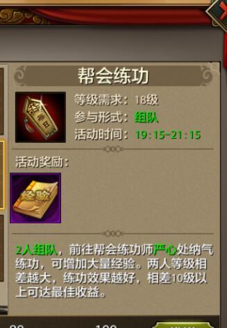 帮会练功也是限时活动,每天可以参加一次,活动时间是紧接着行酒令活动的,19:15-21:15,需要两人组队参加活动,这个活动也是奖励的经验值。主要是组队前往帮会练功师严心处纳气练功,坐在地上传功,就可以获得经验了,组队的两人等级相差越大获得的经验就越多,最好是相差10级以上,活动的时候,可以在帮会中一些低等级玩家一起参加活动,非常友爱哦。