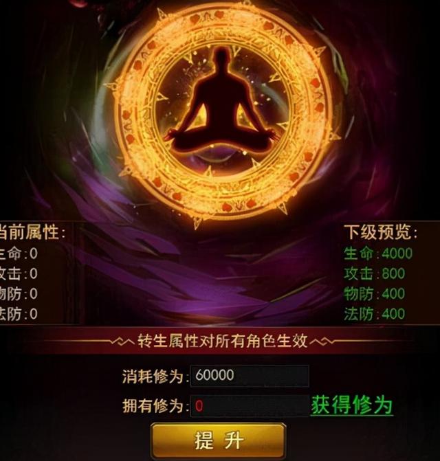 虽然玩家角色要达到80级才能进行转生,但转生方式不一样,所得到的结局也不一样。等级达到80级开启转生系统玩法,转生属性对所有角色生效。转生系统需要修为。修为可以通过等级降级兑换(每天可以兑换5次)获得。也可以通过使用高级转生丹与超级转生丹获得转生修为。每一次的转生之后,玩家都会获得转生效果的加成。转生次数越高,转生的加成效果也就越好。转生次数则成为了衡量玩家战斗力的指标之一。但是转生并不是一帆风顺的。每一次转生都有成功的几率。转生的次数越多,成功几率越低。玩家每天有3次免费转生的机会。如果玩家们元宝不足,三次机会消耗之后当天就无法再进行转生了。当然,玩家们还可以通过花费1000元宝直接购买必转丹百分百转生成功哦!