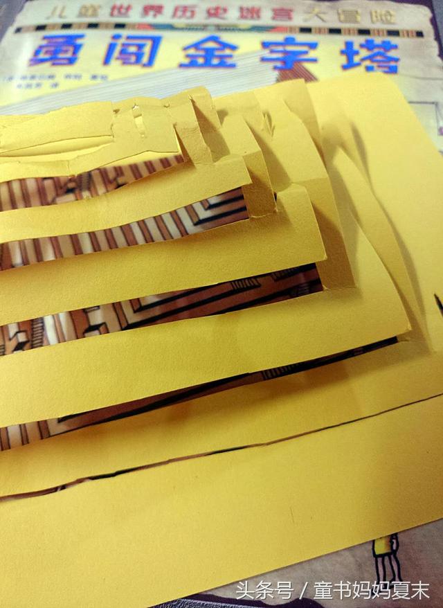 我做了个平面图,孩子们好奇地问这是什么,当我把它拉起来变成四维的,孩子们惊叫起来:“金字塔!”看到这个金字塔,孩子们走进书里的迷宫就变得顺其自然了,和常见的迷宫游戏书不同,这是一个四维立体再现的迷宫图,就如同身临其境一般。