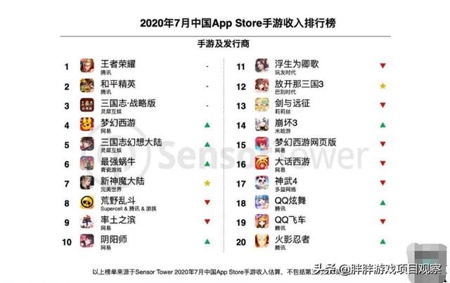随着新游集中在暑期档附近上市,中国区App Store手游畅销榜头部也打破了过往固化的局面,以下是7月收入Top20榜单。