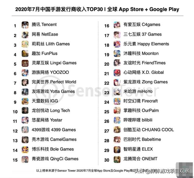 Sensor Tower商店情报平台显示,2020年7月,全球 App Store 和 Google Play 前30名中国手游发行商共吸金18.3亿美元,占当期全球手游总收入27%。