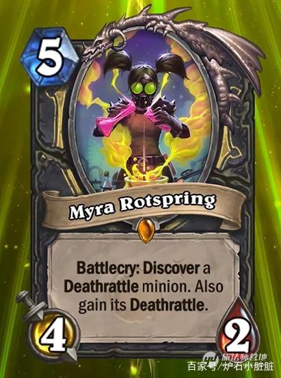盗贼职业传说卡牌:迈拉·腐泉:战吼:发现一个亡语随从,并获得它的亡语。“亡语贼”的小部件,不过似乎和我们收获的前几张卡牌格格不入?从效果上来说这张卡其实是并不亏的,上限也很高,不过缺点也很明显,首先是身材上一个“背刺”就解决的事,获得发现随从的亡语也暴露了你发现的随从,或许在后面的卡牌中会有所配合。