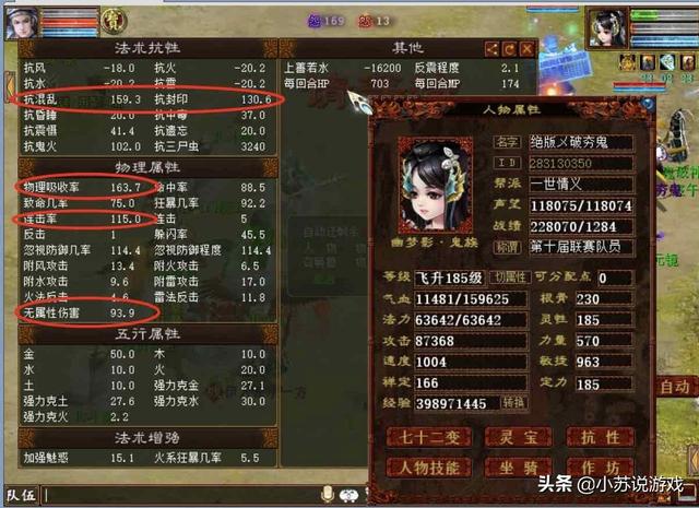 先来看一下他的装备栏,套装方面玩家搭配的比较细心,当前大力最主流的“金麟”套装搭配“兰心”,既可以提升输出能力,还能给自己提升“四抗”。帽子、鞋子使用神兵装备目的也很明显,就是要最大限度提升自己的血量上限。虽然看不到武器的具体属性,但是既然是大力女鬼,那么肯定是绝版破物理神兵了。说实话,小苏当年也有过类似的想法,打造这么一个大力女鬼,只不过后来由于抽秒玩法太过于盛行,最后走上了仙族的路线。