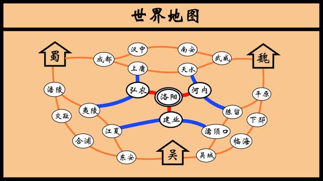 如图,假如我是蜀国,我想要攻打洛阳最快速的路线便是「蜀国-涪陵-夷陵-弘农-洛阳」,或者「蜀国-成都-上庸-弘农-洛阳」。但其实,根据我多年征战九州的经验,最快拿下洛阳的阵营反而最不容易成为最后的赢家,这也是此三国游戏最有意思的地方之处。