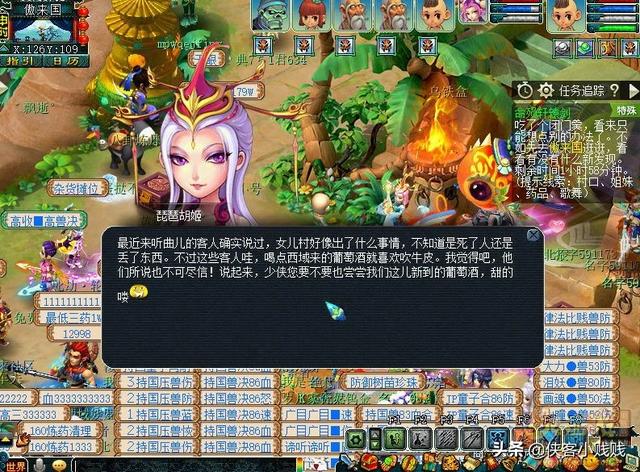 不能进女儿村又没能在女儿村弟子口中问出个所以然,我们只好在附近的傲来国打听一下。询问了红毛猿、琵琶胡姬、蝴蝶妹妹和药店老板还是没有头绪。