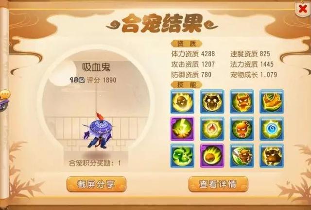 当号主屏住呼吸,慢慢刮开最后一个格子,那一丝蓝色让号主不禁兴奋地跳了起来!没错,这是一只12技能的吸血鬼!虽然目前宠物成长和攻击资质还不是很完美,但还可以用资质丹和炼兽真经进行弥补。而12个技能格子,让这只吸血鬼可以在保证伤害的情况下还有格子来学习防御技能增加生存,相信在完全培养并且打成全红之后,这支吸血鬼一定会所向披靡,成为主人最得力的帮手!
