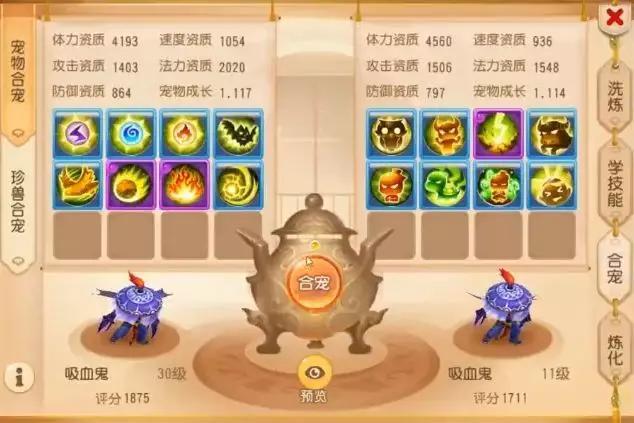 首先我们来看看他准备合成的两只宠物:两只8技能的吸血鬼,不得不说这位号主为了这次合宠一定是付出了相当长时间的积累。两只吸血鬼在资质方面,攻击资质1403和1506还是比较不错的,成长1.117和1.114中规中矩,但8技能吸血鬼的市场价格是绝对不算低的。那么这两只倾注了号主极大希望的吸血鬼能否帮助号主实现愿望呢?