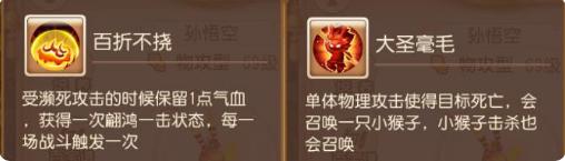 孙悟空:物理系一哥,四扫+吸血。天脉技能百折不挠增加了其生存能力,地脉技能增加了其输出能力。召唤出来的小猴子在当回合是可以直接出手的,而且输出不低。在优势局,生生不息的小猴子使得对面很难翻盘。唯一的缺点就是其攻击目标的不确定性,一旦扫到钢板身上,就相当于浪费了两回合,因此在面对多辅助阵容时要谨慎选用。