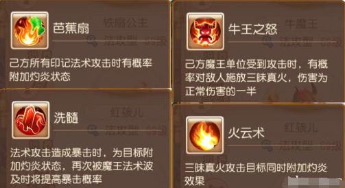牛魔王一家:共享灼炎的吉祥三宝。这一家三口可以说聚是一团火,散是满天星。红孩儿自带大幅暴击率,擅长施加灼炎;铁扇擅长拉印记,并由印记间接附加灼炎;牛魔王擅长召唤牛妖,在家人被打时进行反击。这三人团聚在一起时,一旦打出灼炎,伤害能力将大幅上升。