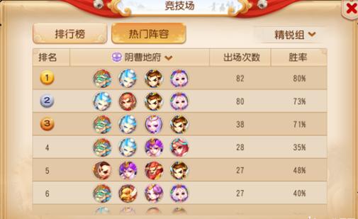 竞技场里,段位达到战将之前,是自选阵容进行竞技的。下图为我们区精锐组辅助门派的热门阵容,都大同小异。不难看出,高胜率阵容都是孙婆婆+惠岸+小白龙+输出。因此可以放心使用这套阵容,阵法就选择自己等级高的使用。