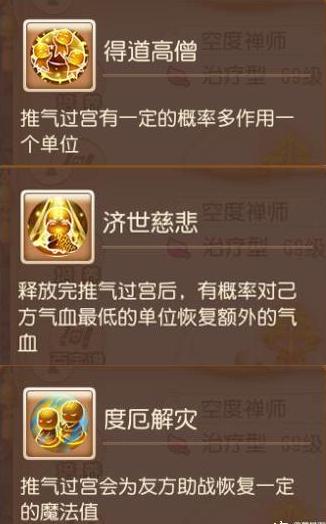 空度禅师:能回蓝的大奶。“得道高僧”和“济世慈悲”使其有概率一回合推6个。而随着炸蓝战术的逐渐流行,能打蓝和回蓝的助战也受到了越来越多玩家的青睐。地脉技能“度灾解厄”在推血的同时还能恢复魔法值,是非常实用的技能。