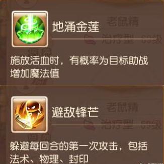 老鼠精:自带虚幻的烦人精。和空度一样,老鼠精也可以为助战回蓝。同时,特色技能“避敌锋芒”使其可以稳定躲避每回合受到的第一次攻击,这意味着除非对面选出双封阵容,不然必不会被控。相比之下,老鼠精的两个本命技能反而没那么出彩了,因此是一个不怎么吃资源就能发挥作用的好助战。