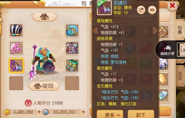 至于腰带并不是简易,而是60级的双魂引。就这件装备,“双蓝”成为了最大的亮点,首先就是特效:愤怒,想要在游戏中使用大特技,就需要有愤怒腰带,因此这一蓝字也相当关键;其次,就是“罗汉金钟”的特技,在它的加持下,可以提升全体单位的法术防御,从而更好地应对法系的攻击,综合来看,这条腰带真的很不错。