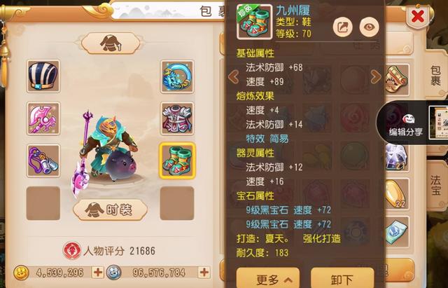 最后一件装备就是70级简易鞋子,初始速度+89,再加上熔炼出的4点,总速度则为93。现如今,很多法系门派都在追求高速度,而这双鞋子就可以提升不少,挺好用。