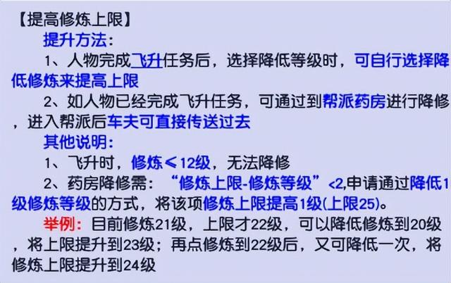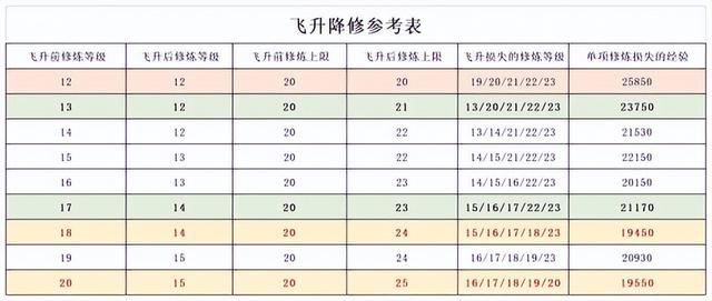 表中之所以选用修炼经验计算是因为各类修炼花费的不同。比如,你如果是以17级修炼飞升,那么你的修炼上限就是23级,当你点到23级后,需要通过降修的手段来提升修炼上限。那么,你所损失的修炼经验就等于2810+3150+3510+5610+6090=21170点。