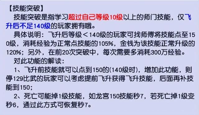 109飞升129其实有两种模式,一种是满足基本飞升条件,即109升级到135级后,飞升降到120级。一种是一步到位,即109直接升级到144,飞升后降到129级。两种模式所需花费的经验、储备金均不一样,而这两种方式最大的区别就在于【技能突破】的花费。绝大部分玩家是选择点满主要技能再进行飞升的,比如龙宫就点满群秒和基础技能,这样飞升下来也是秒7,比较舒服。