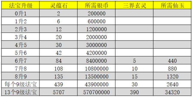 给大家统计出了法宝升级的具体消耗,以供参考。