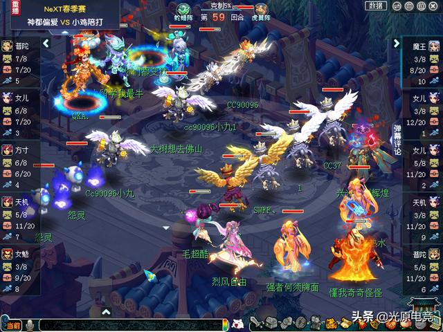 观战方神都偏爱阵容:魔王、双女儿、天机、普陀;对战方小鸡陪打阵容:女魃、双女儿、天机、普陀。对战方蛇阵小克观战方虎阵。双方都是大蓝流,并不急于发起进攻,前期以打状态为主,优劣势并不明显。第59回合,观战方天机城点杀了对战方女魃墓,不过有罗汉在场,对战方女魃墓还是很快被拉起。第61回合,对战方女魃墓再次中大死亡倒地,不过对战方迅速出了阳护宠解除大死亡状态,并反点杀了观战方天机城。对战方罗汉不断,同时不断打观战方蓝,逐渐取得优势。经过72回合的鏖战,对战方小鸡陪打战队获胜!