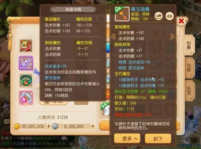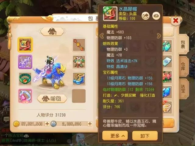 首先是一个100级的双蓝字头盔,熔炼后711的魔法106的防御,还是比较不错的。特效法术连击+2%,特技是晶清诀, 解除我方群体异常状态并回复15%的气血。一般来说法系输出位对于特技的要求相对还是比较低的,不过在队友被控制的情况下,多一个晶清诀有时就能起到至关重要的作用。