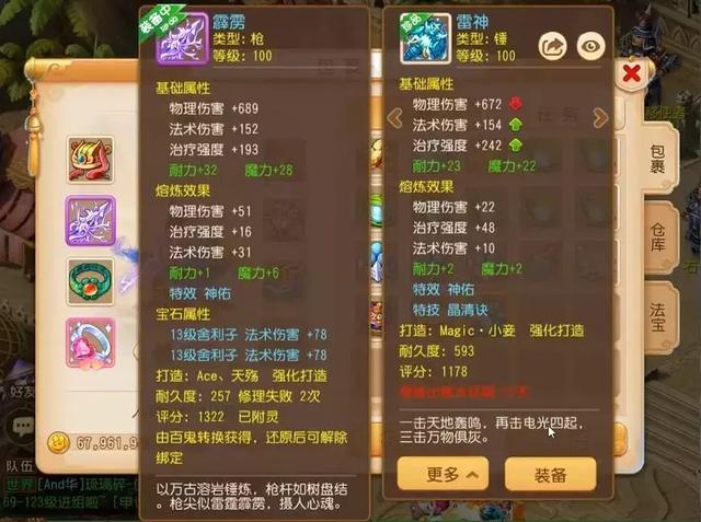 最后是两把100级的武器,装备中的这把绿字属性魔耐双加67相当不错,毕竟站得住才能有输出嘛,装备特效是神佑,战斗死亡时有20%的几率原地复活并恢复300气血。对于神威玩家来说,神佑武器是相当重要的,这20%的几率是可以带来更多翻盘的机会。而背包里的这把武器绿字属性魔耐双加49虽然不如装备的这件高,不过它不但拥有神佑特效,号主也把它洗成了晶清诀特技!虽说4个晶清诀并不能有什么额外提升,但是号主能够洗出4件晶清诀,堪称洗特技能手了!
