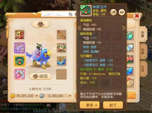 接下来是一条100级的双蓝字腰带,熔炼后1002的气血和80的物理防御比较可观,不过同时拥有愤怒特效和晶清诀的特技就相当难得了。毕竟在跨服摆摊里,100级的愤怒特技腰带就已经超过7000万金币了,而由于100级洗炼石价格的昂贵,拥有好特技的腰带更是有可能卖到上亿。据号主说全身装备的特技都是自己洗出来的,而且经常出晶清诀,不得不佩服号主的运气。