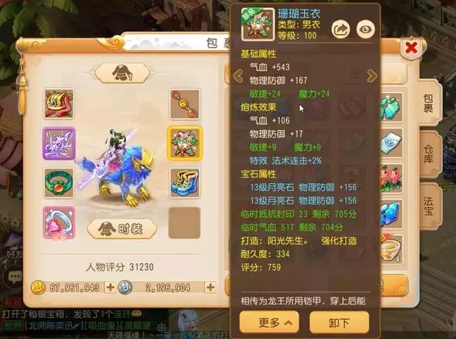 100级的男衣,虽然衣服只有法术连击特效并没有特技,不过熔炼后绿字属性魔敏双加66,对于带4颗黑宝石的敏龙来说是相当不错的,毕竟敏龙要同时兼备伤害和速度,绿字属性能够带来更多的提升。