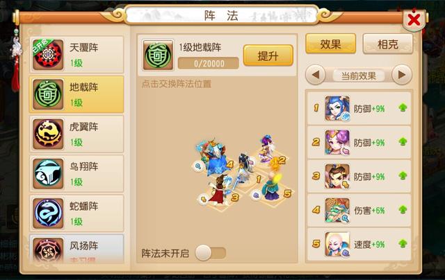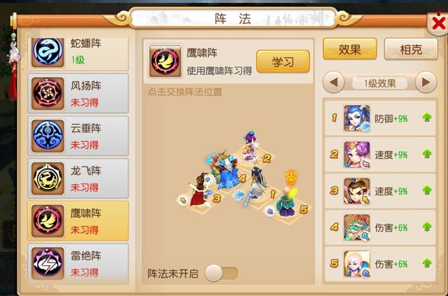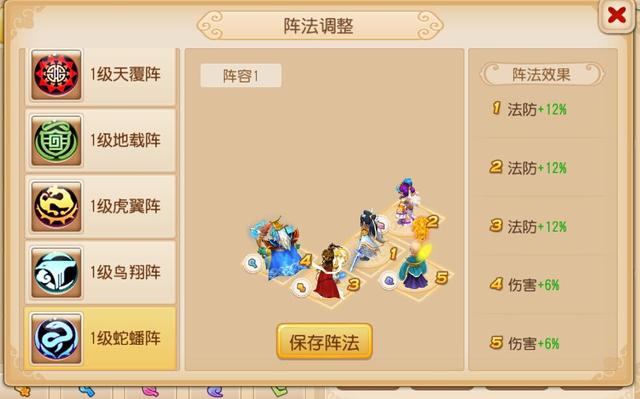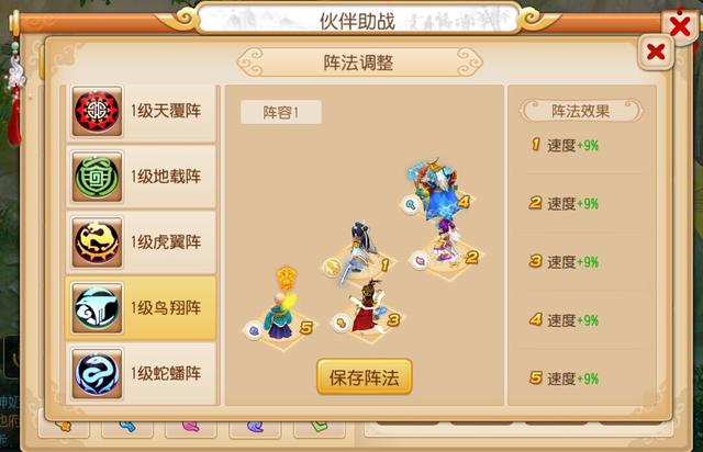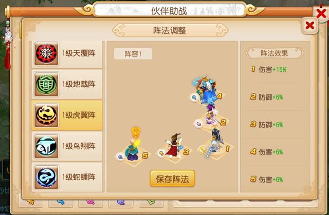 虎翼阵是小编除了天覆阵最喜欢的阵法了。从二十级主线开始一直用这种阵法。因为虎翼阵的所有加成都很有效,对于输出职业来说,自己站一号位,两个助战治疗战防御位置,两个输出站45号位。而且输出职业类型没有限制,也没有减益。最好不过了。