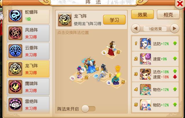 天覆抄阵,全体加伤害减速阵法,日常任务首先阵,PK多龙打法必配阵法,稳定输出及减速控尸。龙飞阵,5级龙三位置高达30%的法伤及30%的减速,让龙宫完全可以控好尸体。何况其他位置的加成也是非常不错的,4号物伤5号物防1号法防都高达20%,2号的速度也是所有阵法中所有达到的最高15%。可以说龙飞阵是十大阵法中最全面加成的阵法也不为过。适合双输出三辅助阵容,也可以三输出扩展资料1:《梦幻西游》是一款由中国网易公司自行开发并营运的网络国产游戏。游戏以著名的章回小说《西游记》故事为背景,透过Q版的人物,试图营造出浪漫的网络游戏风格。扩展资料2:关于梦幻西游同类型回合制手游,可以关注风林手游(14294.com),有很多高福利BT版的回合制手游,还有大量礼包码和大额抵扣劵可以领取。