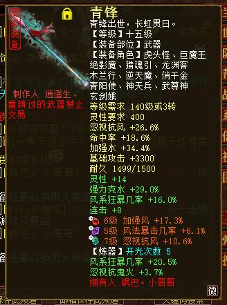一把重铸过的十五级武器,原始黄色属性还是很平常的,忽视抗风26.6%,这个初始忽视并不算极品,而且没有蓝字属性。但是绿色炼化还是让人眼前一亮的,风系狂暴16%,强力克水29%,还有14点灵性,对于追求高灵性的炮来讲,这个属性是非常让人心动的。开光属性更是让人惊叹了,居然开光出了风系狂暴20.5%,这是多少5阶6阶仙器玩家都梦寐以求的开光属性。