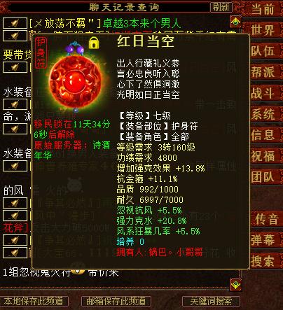 护身符也不简单,992品质,黄字强克13.8,绿字忽视抗风5.5,克水20.8,风系狂暴几率5.5,也算是比较极品的属性了。